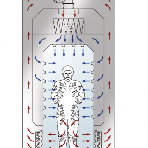 Soufflage à grande vitesse de jets d’air filtré HEPA, dirigés vers l’opérateur.